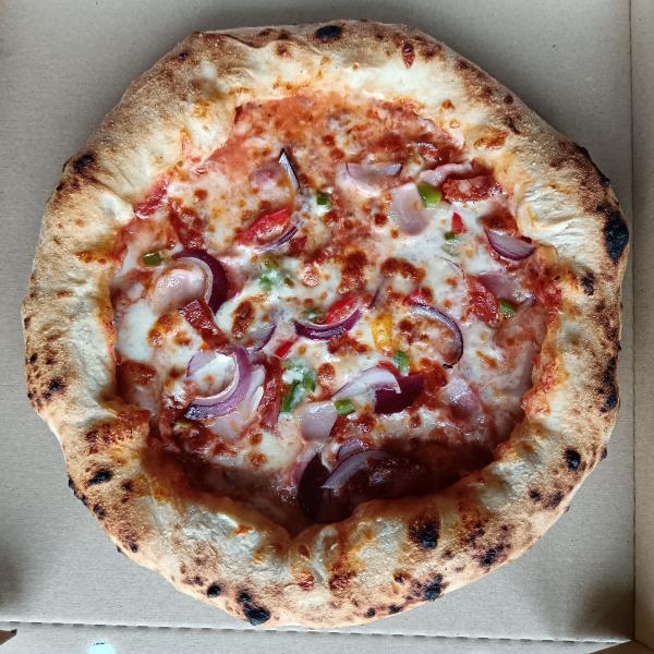 baconnel töltött szél, paradicsomszósz, csípős szalámi, bacon, lilahagyma, kaliforniai paprika, bazsalikom, mozzarella sajt, olívaolaj - 32 cm